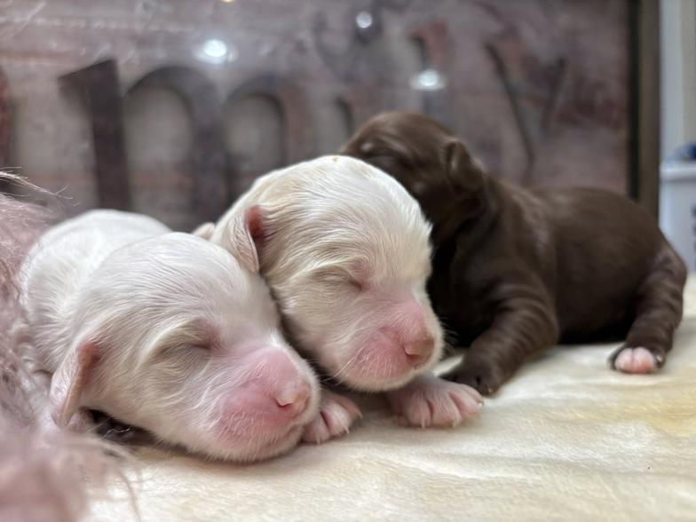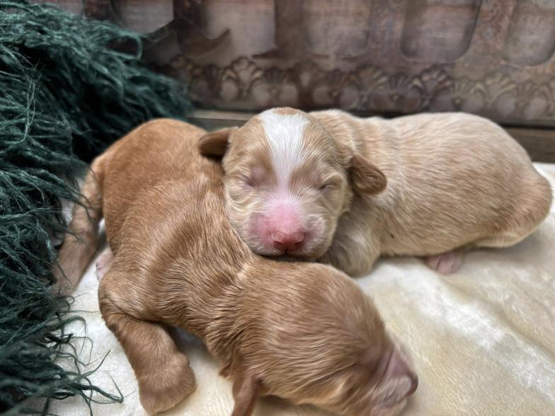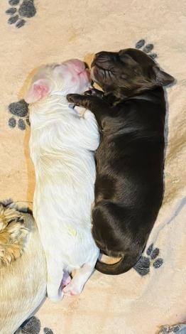 5 puppies born, 2 Boys and 3 Girls. The boys are one red and one apricot with white markings. The three girls vary. Almost white, white with an apricot saddle, ears, apricot eyes and one chocolate brown with small white back toes.